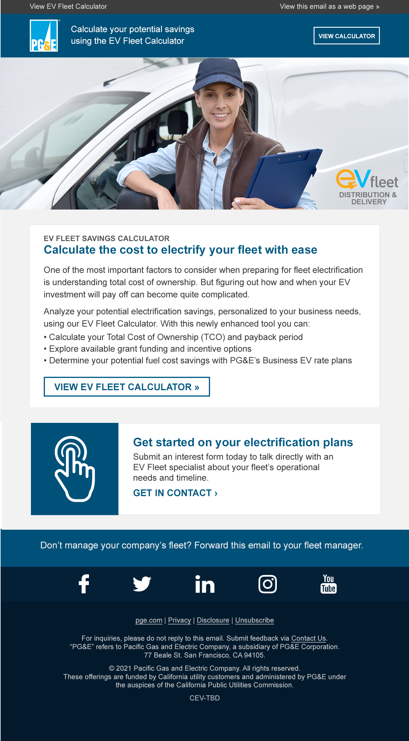 The 2021 Pacific Gas and Electric (PG&E) Savings Calculator email provides fleets with a way to calculate overall savings when converting to an electric fleet. The email was designed to reach fleets and provide them with a visual representation of how much they could save over time by making the conversion.
