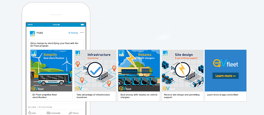 This LinkedIn image carousel was designed to showcase the PG&E brand’s message over multiple images, immersing the audience with each swipe. The carousel highlights and promotes the EV Fleet Electrification Program to potential EV Fleet business customers. This was a multipronged campaign that was aligned with a video ad as well as subsequent datasheets and email campaigns.